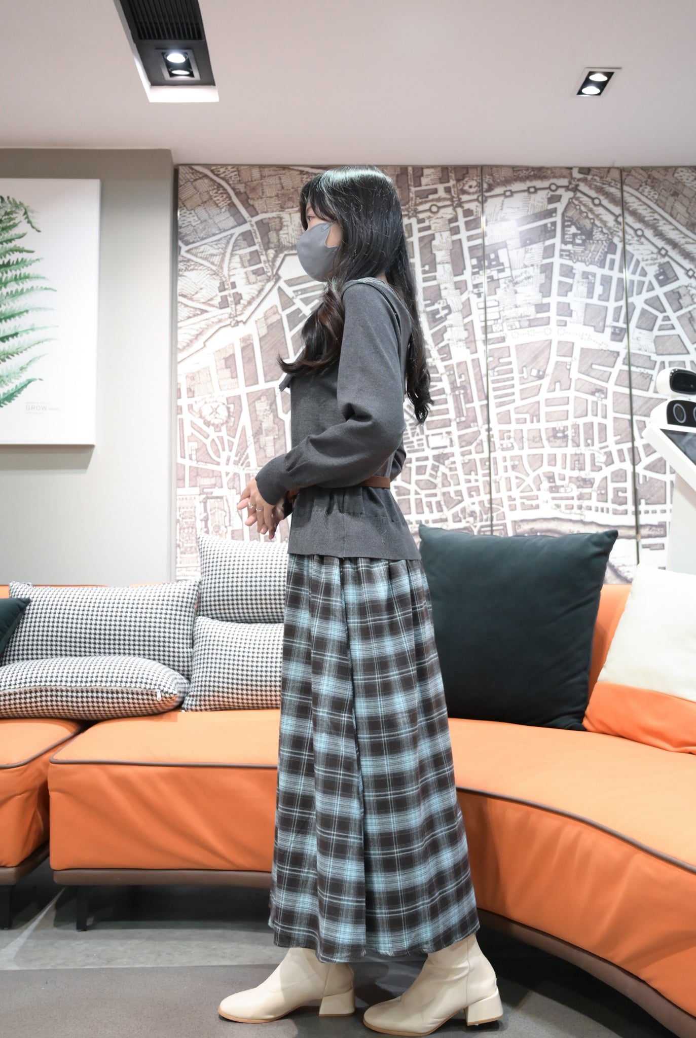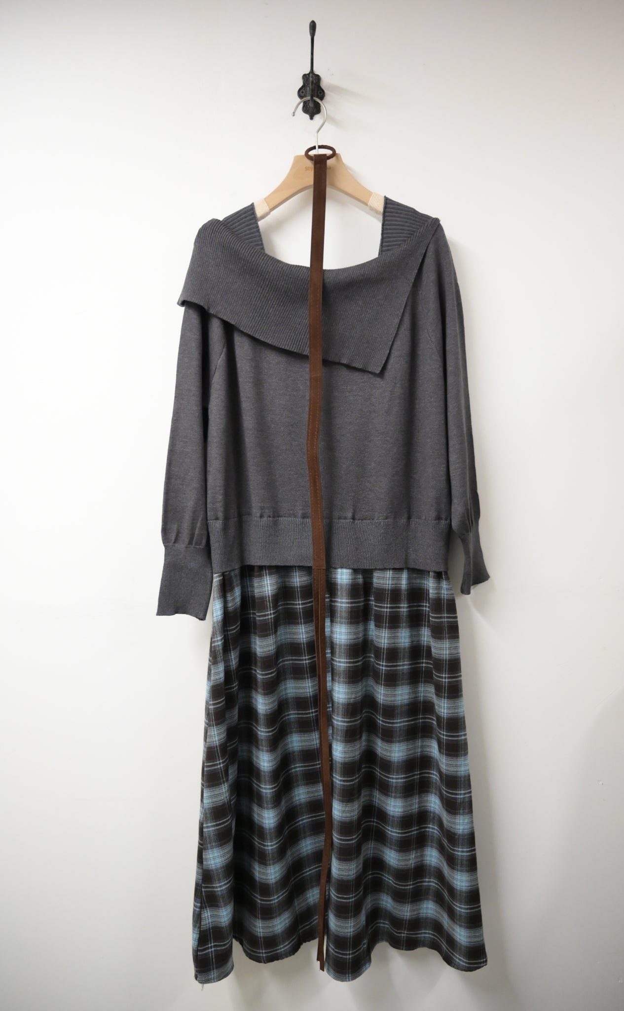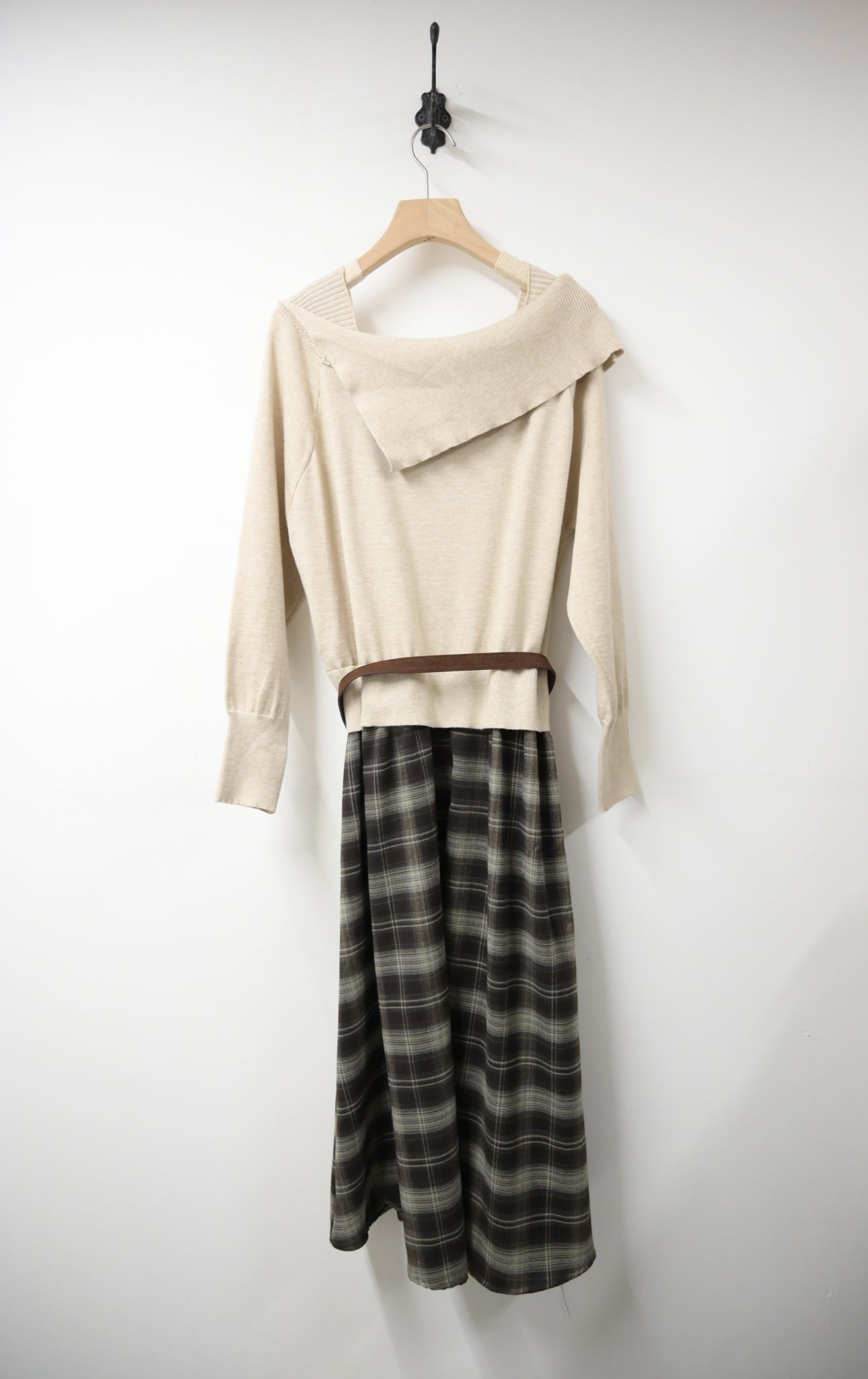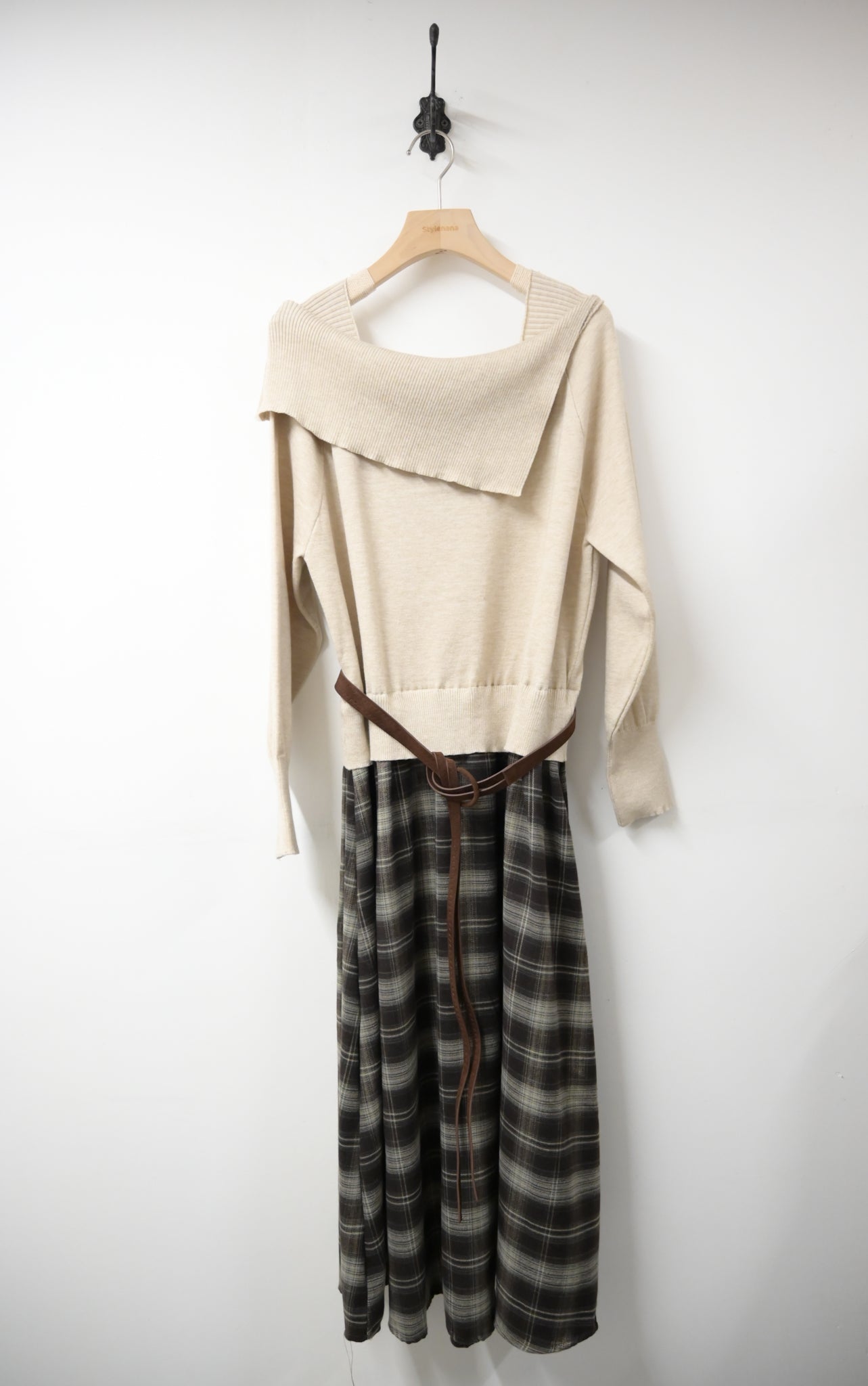 秋冬・反領針織拼接格仔寬鬆長裙連belt 2色入 1W61127